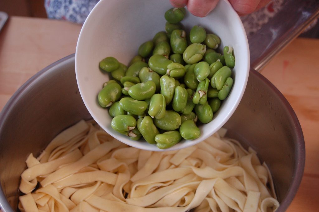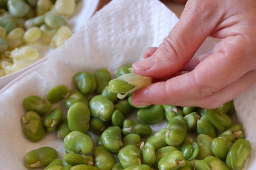 Spend a bit of time double podding your broad beans – it’s worth it to reveal the gorgeous bright green colour of the beans which is hidden by the tough bitter silvery skins.Remove the beans from the outer pod and plunge the beans into boiling water for just a minute then drain and plunge into cold water. Drain again then remove the skins from the beans. This is really easy and quite therapeutic! Just nip the skin with your fingers and squeeze the bean out.