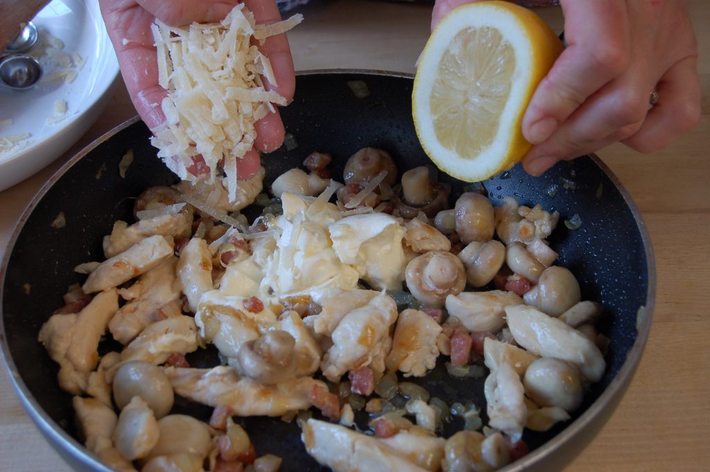 - Heat the oil in a frying pan then add the pancetta and fry until crispy and golden brown. Remove and put to one side then add the onion and garlic and fry gently until softened. Add the chicken to the pan and fry until cooked through. Finally add the mushrooms to the pan and fry for 3 or 4 minutes.