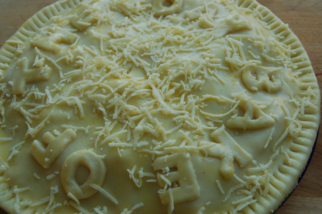 - Brush all over with some beaten egg then sprinkle a little grated cheese on top.