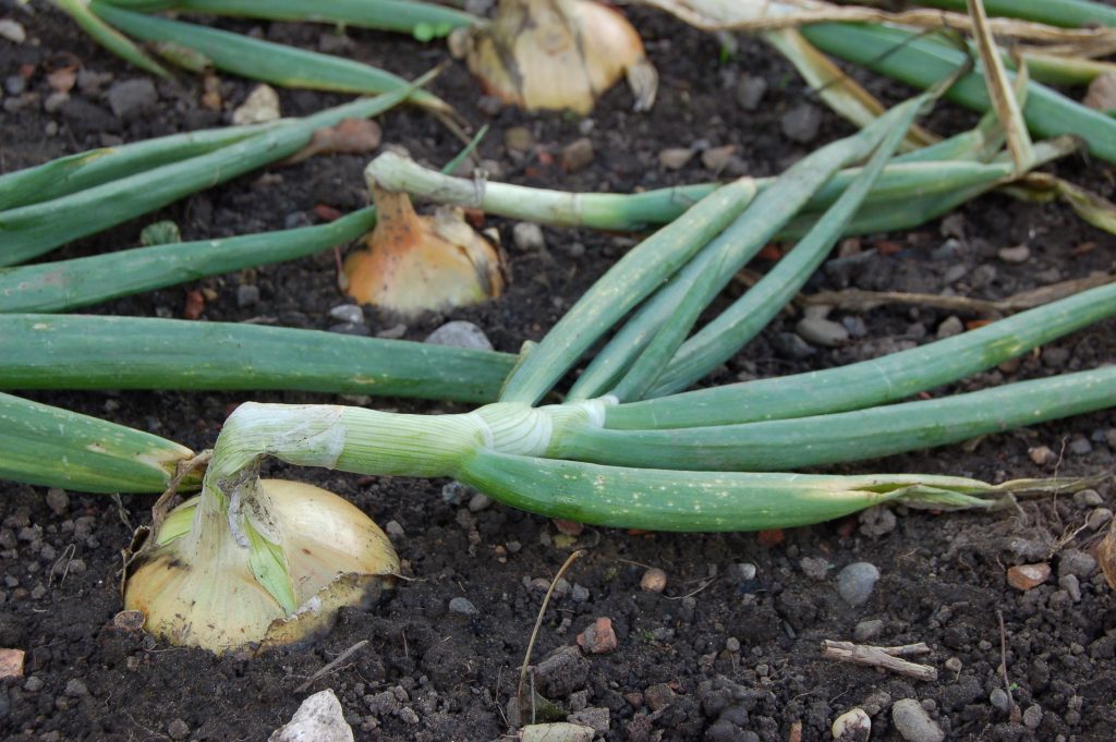 Bend the tops of your onions over to help the bulbs ripen over the next few weeks, before lifting them.