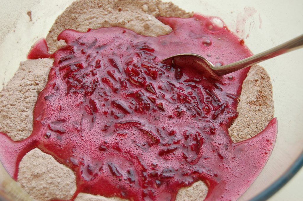 - Make a well in the centre of the dry ingredients and pour in the beetroot mixture. Fold in slowly making sure everything is incorporated but don’t over work the batter.