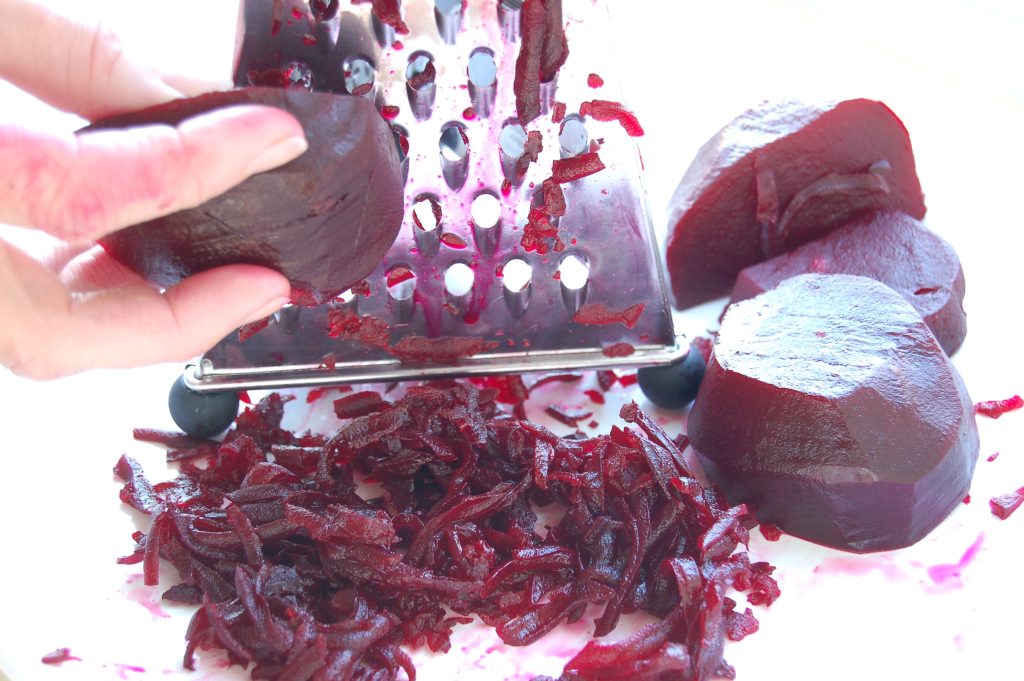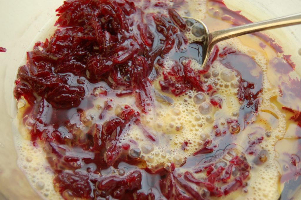 - Peel the cold, boiled beetroot and either puree in a food processor or grate finely. Put into a bowl and add the oil, eggs and vanilla essence. Beat together well.