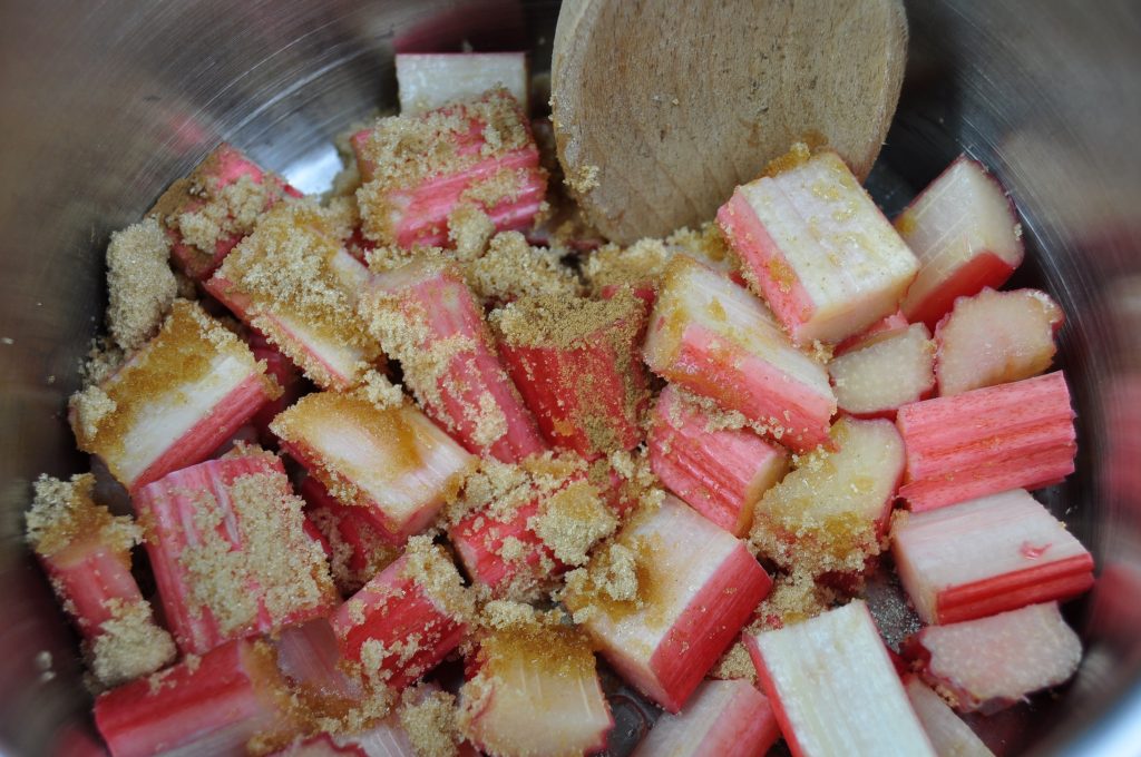 - Put the rhubarb into a smallish saucepan and sprinkle over the sugar and cinnamon. Stir well then cover and simmer over a gentle heat to dissolve the sugar, stirring occasionally