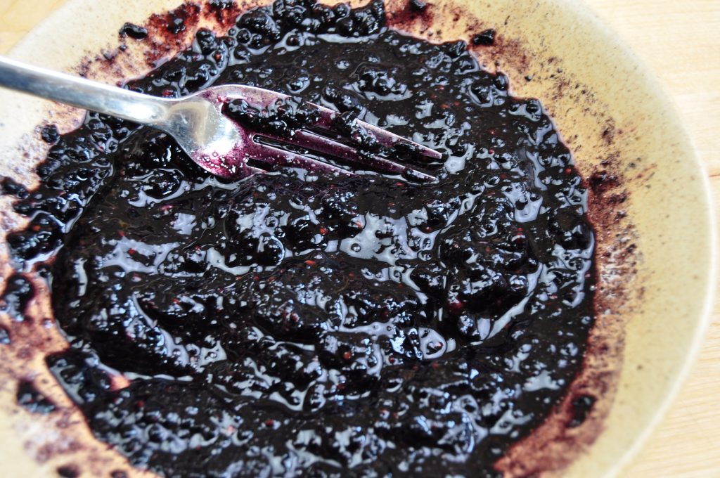Add 1/3 of the crushed blackberry fruit into one of the bowls and stir gently together