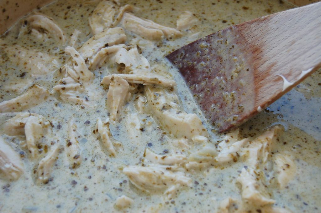 - Use 2 forks to shred the chicken into bite sized pieces then stir in half the mascarpone and the pesto. Simmer gently for a few minutes to thicken a little. If you like your sauce a little thicker then add in a couple of teaspoons of cornflour mixed in a little water and stir in