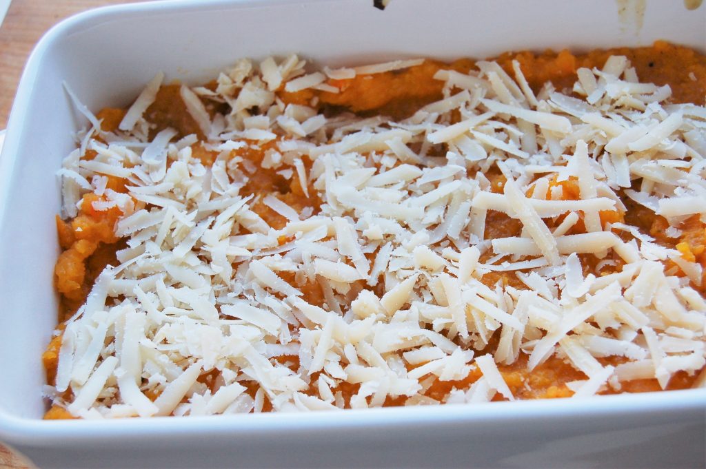 - Spoon half this mixture into the bottom of your dish then cover with lasagne sheets. Spoon over the squash then sprinkle over half the parmesan