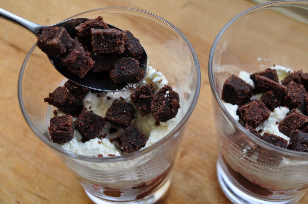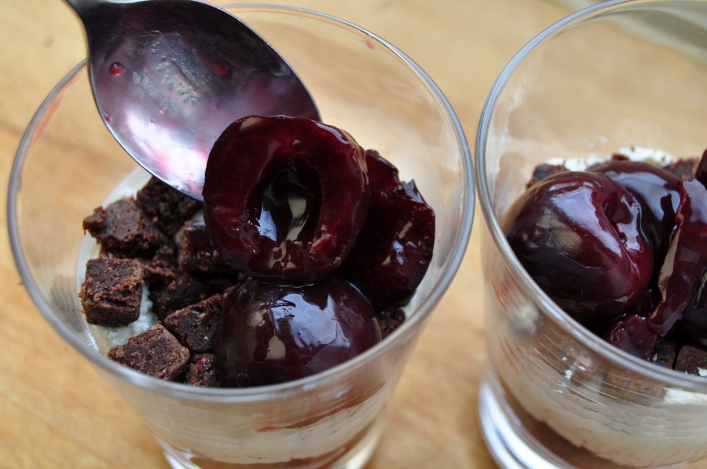 • Time to put everything together – start with a cherry or two I the bottom of you glass then add a layer of brownies. Spoon over some more cherries along with some juice to soak into the brownies. Add a layer of cream then repeat to the top of your glass
