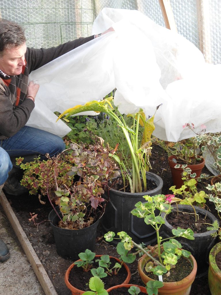 If you are overwintering borderline hardy plants in a greenhouse, on frosty nights drape a couple of layers of fleece over them to keep the frost off and don’t allow the compost to get too wet, just damp is ideal.