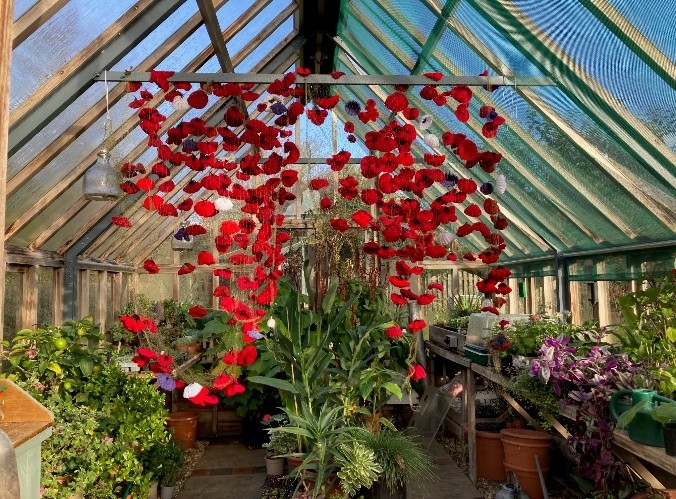Winter is now well and truly with us, and we’ve had several hard frosts, a little snow and a fair amount of rain. In fact, I want it to stop raining now as our soil is plenty wet enough and starting to hamper work in the garden. When it is fine and dry I’m trying to do as much work outside as possible and at the moment I’m starting to prepare some new beds by lifting the turf and forking over the areas to allow frost in to break up the soil. The plan is to have these new areas prepared and ready for planting in March when the soil is warming up. Any work in the garden at this time of the year is of course hampered by short days. By half past three it’s starting to get dark and time to gather my tools to put them away. Fortunately, I can still potter in the greenhouse or potting shed when it’s dark outside because we have a light in the greenhouse! The greenhouse is full of plants being overwintered, so imaging my shock recently when I went into find an amazing crop of poppies!  Unbeknown to me, Mrs Fish had draped nets of knitted poppies that are used in the village for Remembrance Sunday to dry before being stored for next year. I’m tempted to leave them as they add a splash of colour.