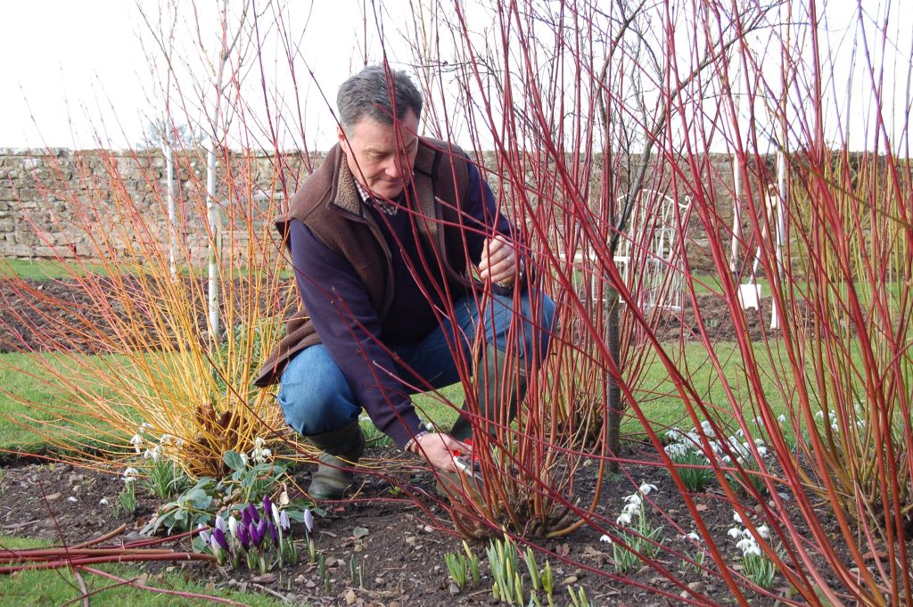 The colourful stems of dogwood can be cut down to almost ground level from mid-March onwards. It looks drastic, but it will encourage strong new growth over summer with bright stems for the winter.