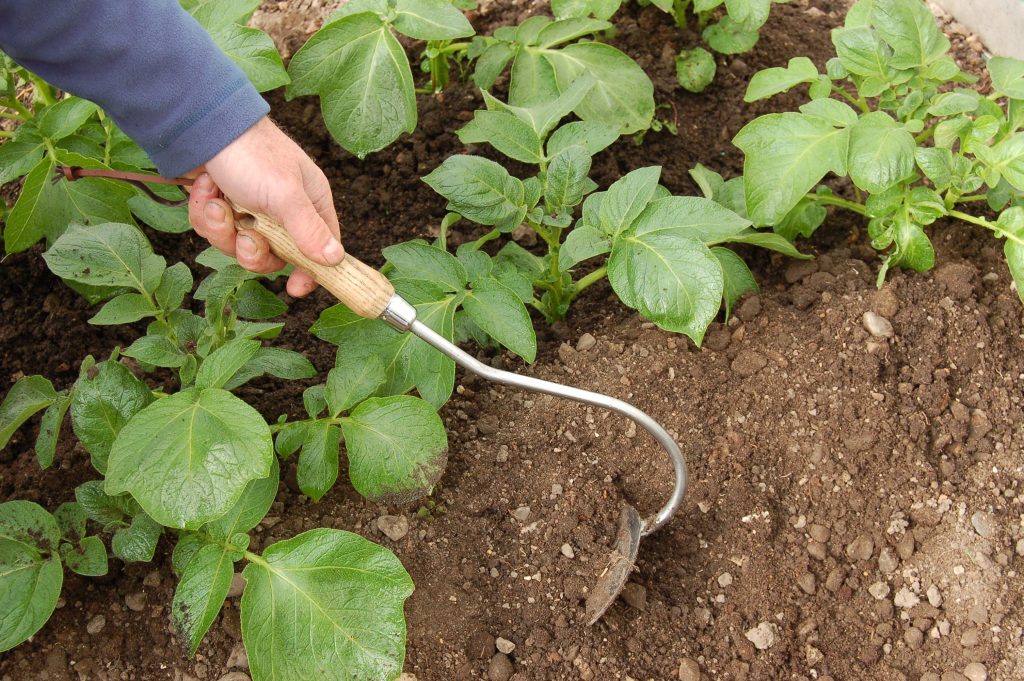 Continue to ‘earth-up’ potatoes to form ridges of soil around the plants. Use a spade or hoe to draw soil up around the stems to encourage more tubers to develop from side shoots in the ridges.