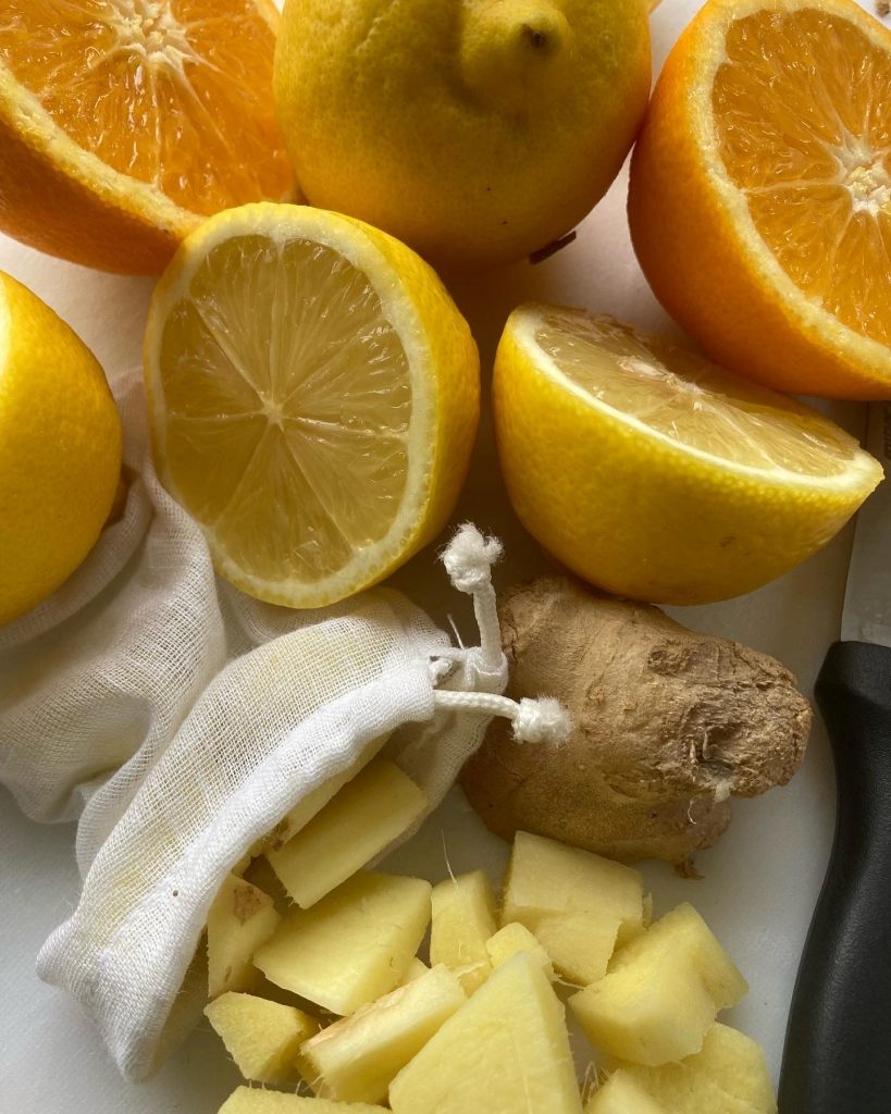 • Use a zesting knife to thinly peel the lemons and orange and secure in a muslin bag with the root ginger.