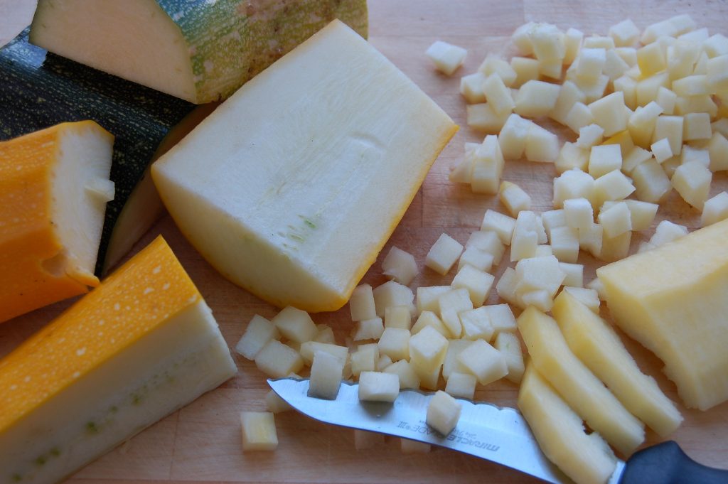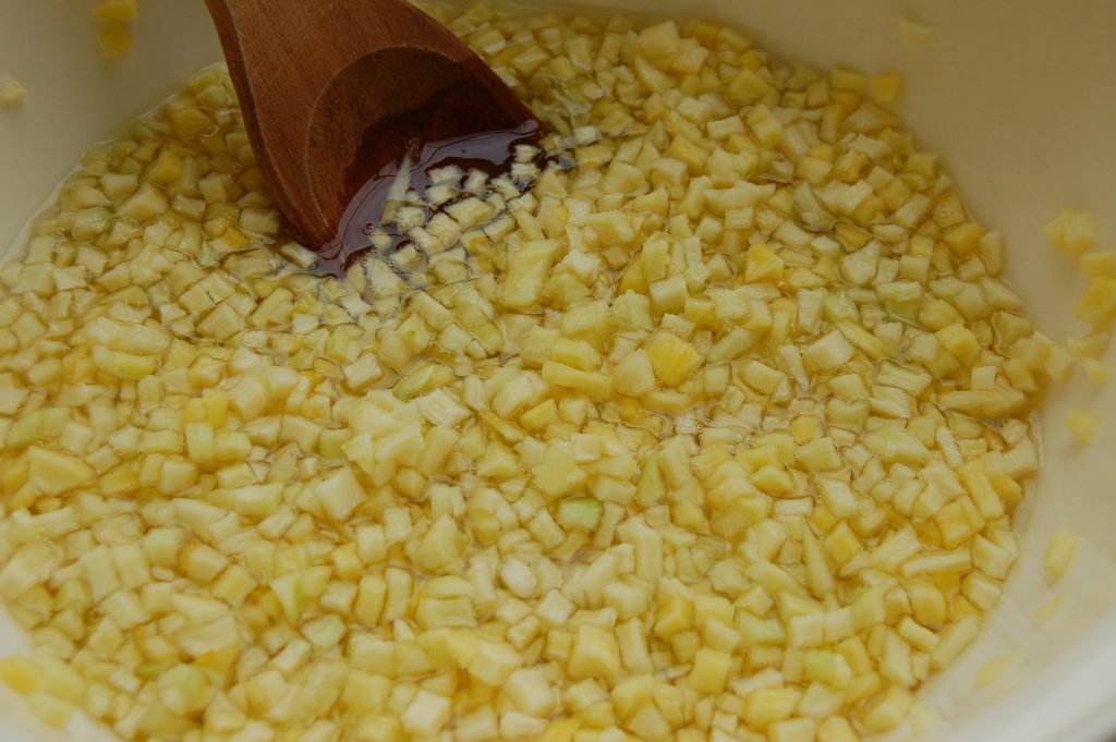 • Dice the marrow into small (up to 1cm) cubes. Put in a large basin with half the sugar. Stir well, cover and leave overnight. It will produce a lot of syrup so don’t worry!