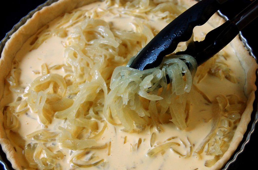 - Carefully place about half the onions into the flan case then pour in half the cream mixture. Lay over the remaining onions and pour in as much of the cream filling as you can. Leave a little room for expansion! Grind over a little more black pepper.