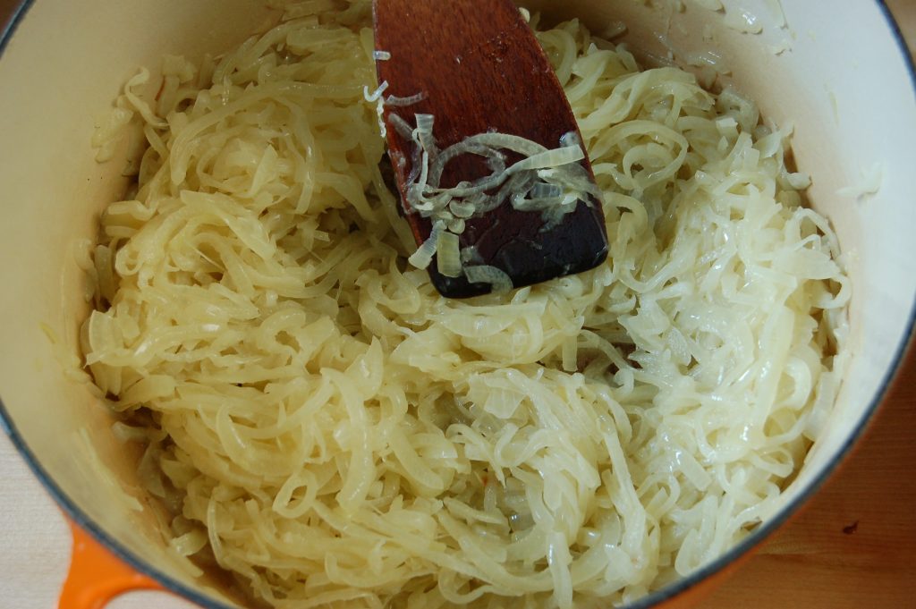 - Melt the butter in a heavy based, lidded pan, add the onion slices and try and coat thoroughly in the butter. Pop the lid on and turn the heat low. Leave to cook for about 30-40 minutes, stirring fairly often.