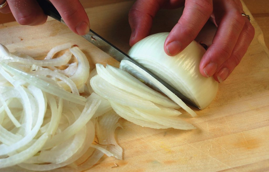 - Whilst the pastry is chilling, prepare the onions. I find it easiest to cut in half lengthways then cut the root off and peel. Lay flat on a chopping board then slice as thinly as you can.