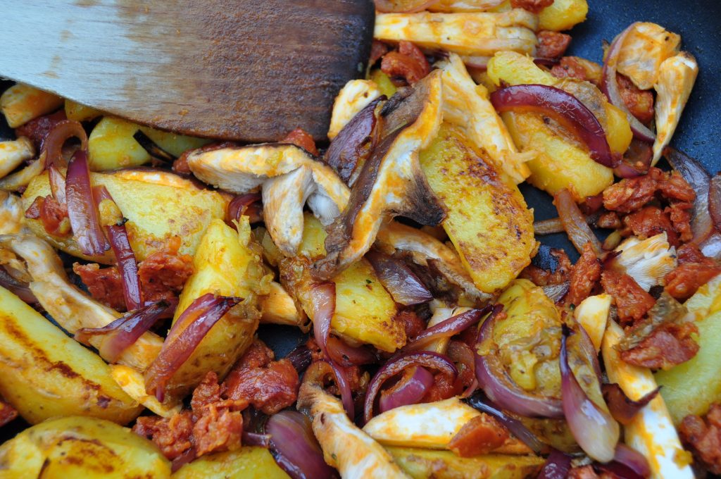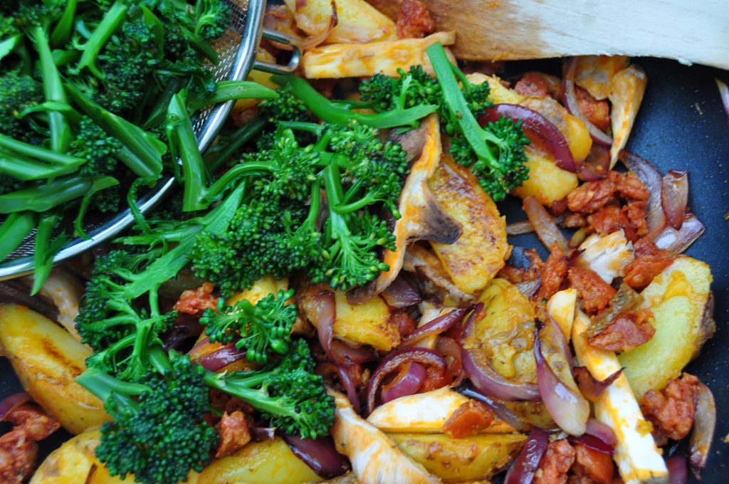 Purple sprouting broccoli, chorizo and potato hash