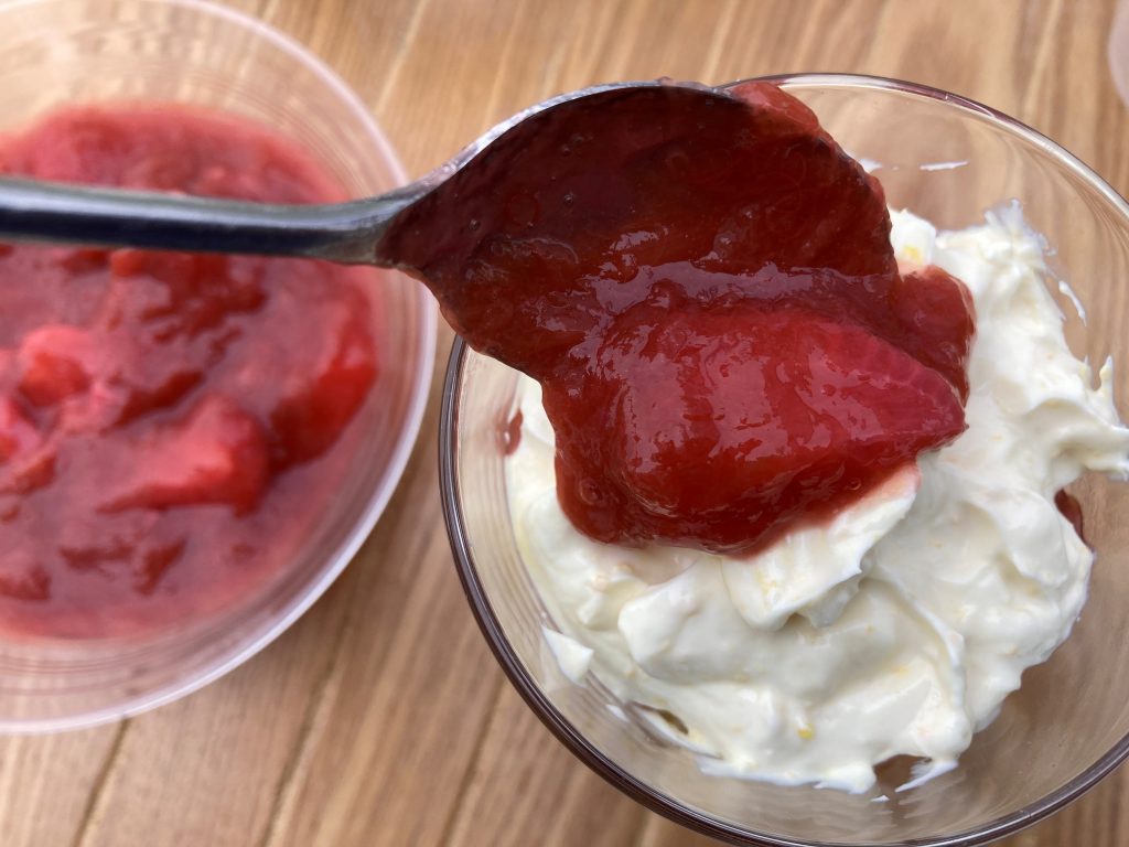 The optional strawberries add an extra flavour which works well and adds a little colour to the rhubarb. If you’re using forced rhubarb I wouldn’t bother with the strawberries. If your rhubarb is very green, try adding a tiny drip of red food colouring to brighten it up a little!