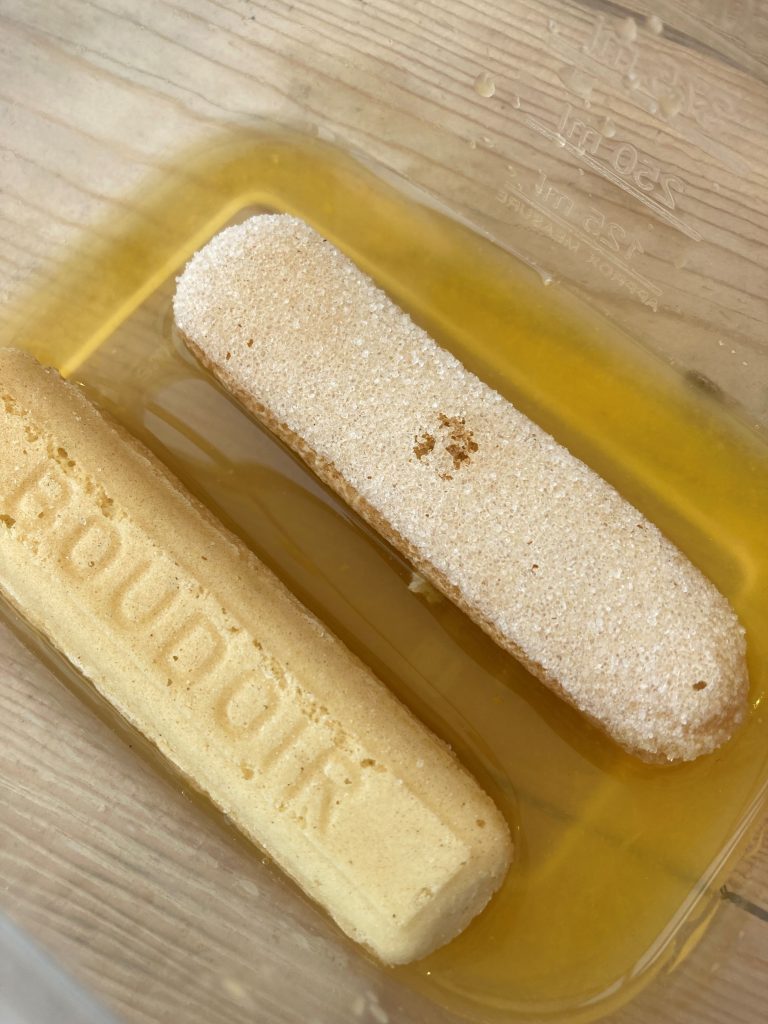 - Put the orange juice into a shallow dish and pop in the lady fingers. Leave to soak for a short while then carefully break into 2 or 3 pieces depending on the size of your serving glasses.