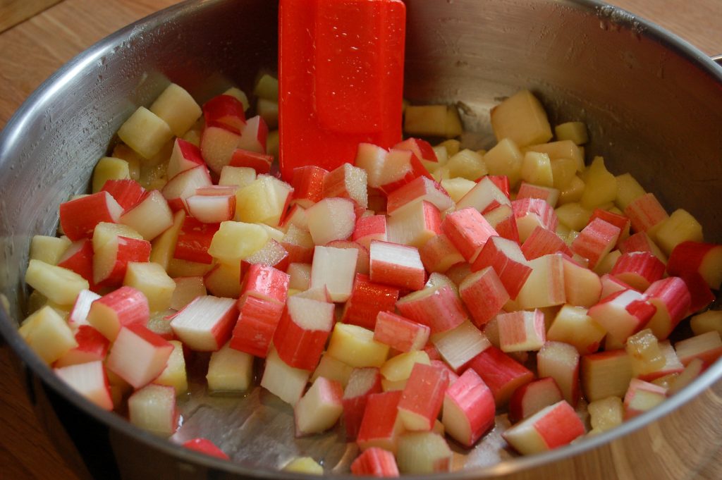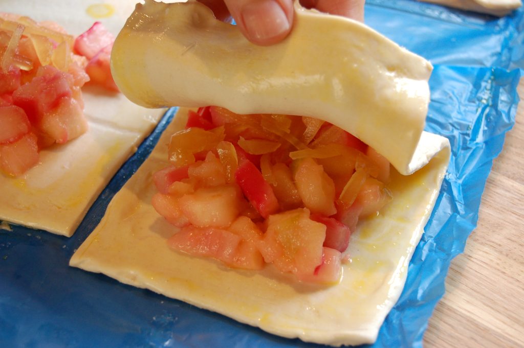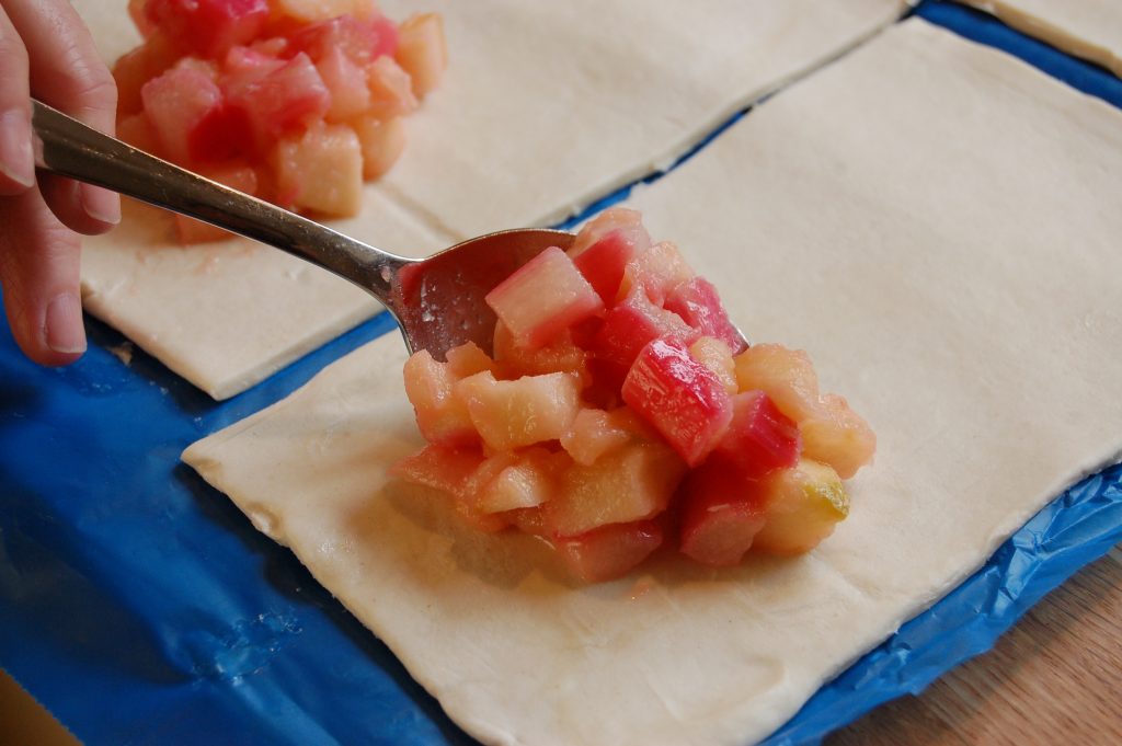 • Put a large spoonful of the rhubarb and apple on each rectangle. Place it on one half keeping it away from the edges. There will be some fruit leftover so keep to one side.