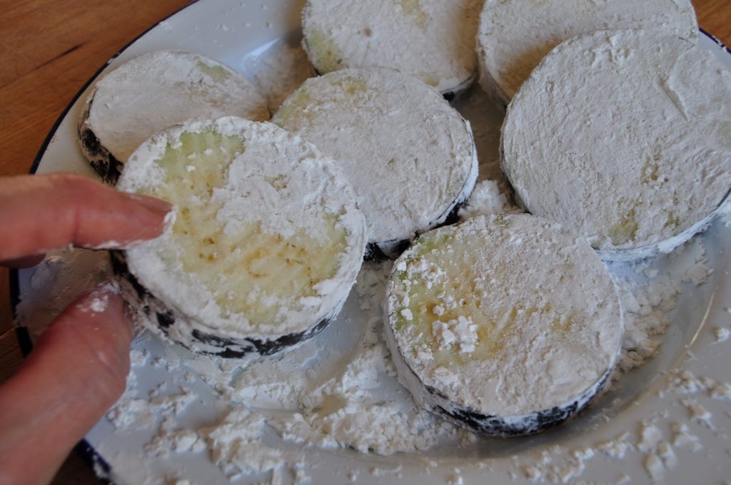 - Scatter the cornflour onto a plate and coat the aubergine slices on both sides.