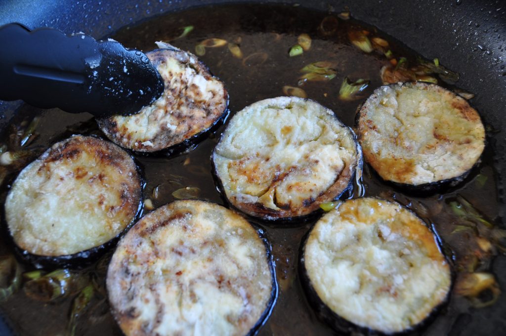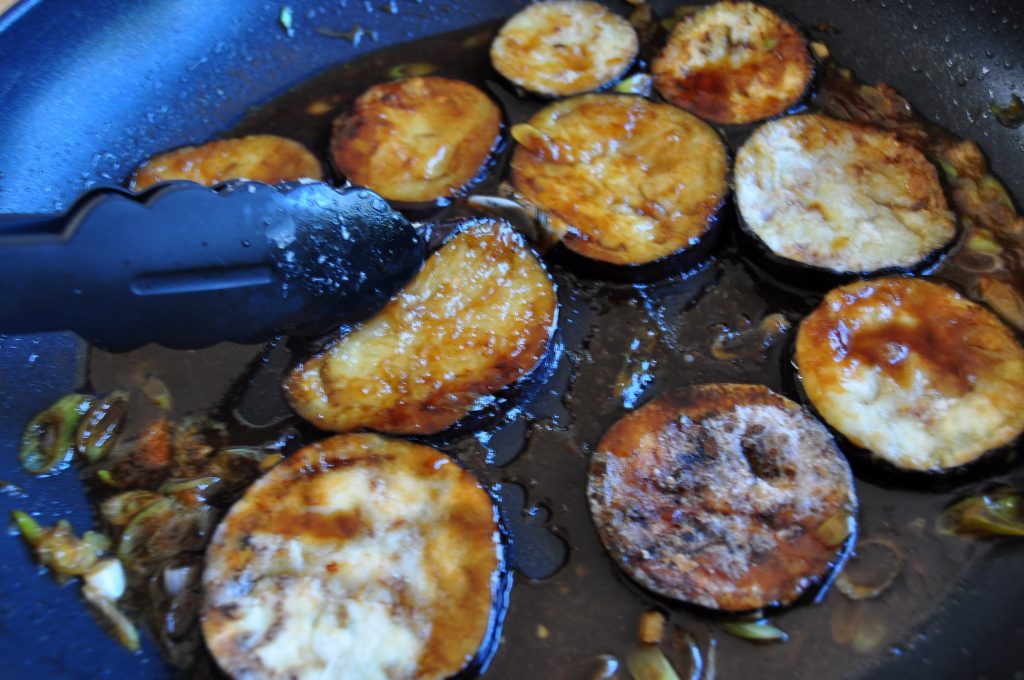 - Heat a good glug of oil in a frying pan over a medium heat then fry your aubergine for about 5 minutes on each side until browning getnly. Remove from the pan and set aside.
